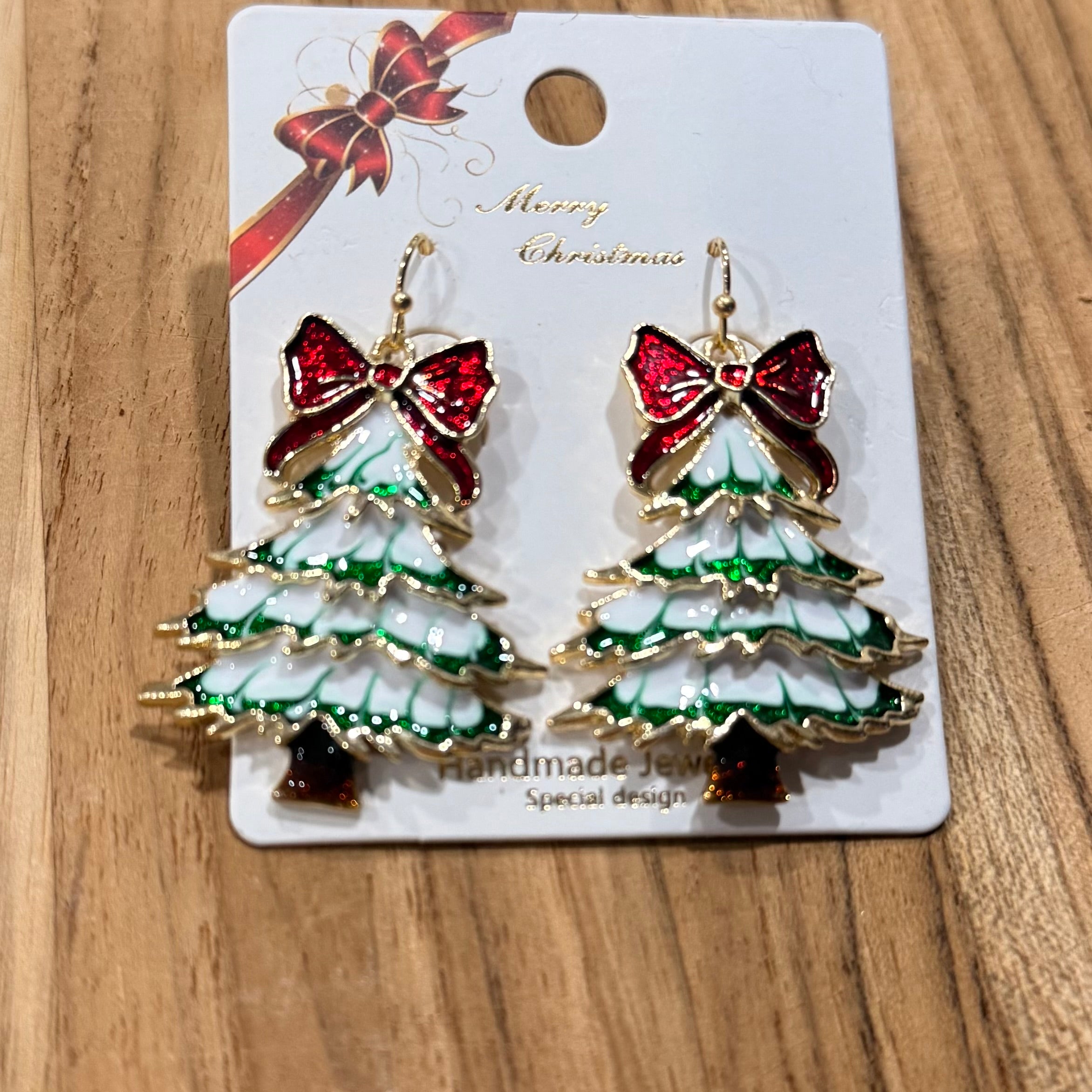 Green Frosted Tree w/Red Bow Earrings
