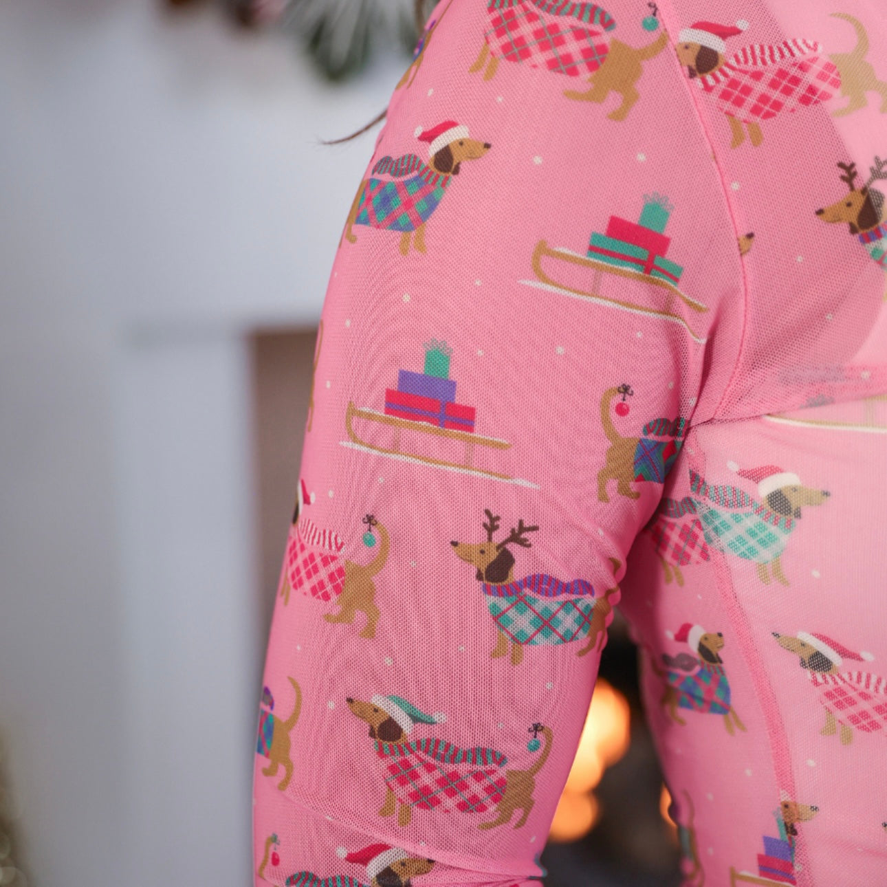 Get trendy with the Keigan Mesh Top- Pink Pawliday! This playful top features lettuce hems, a mock neckline, and a sheer mesh material that can be layered under or over any outfit. Don't miss out on this trendy addition to your holiday wardrobe!