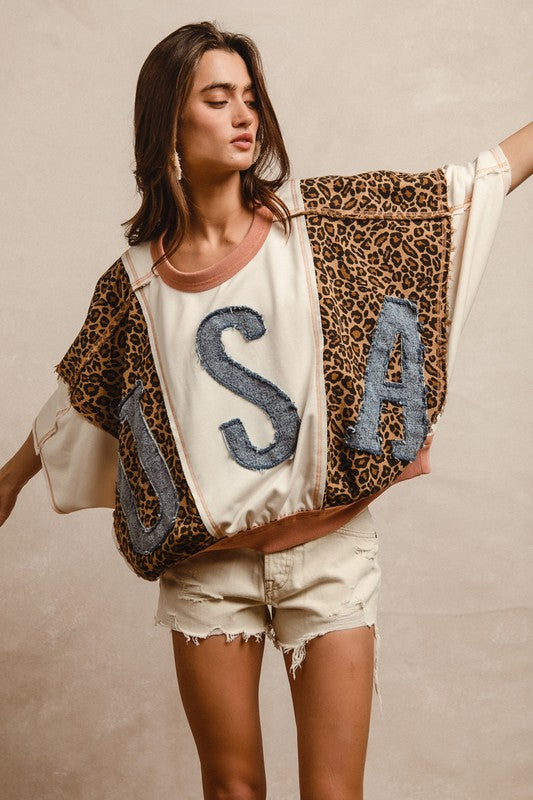 Leopard Mix and Match Usa Letter Patches Overlock Top