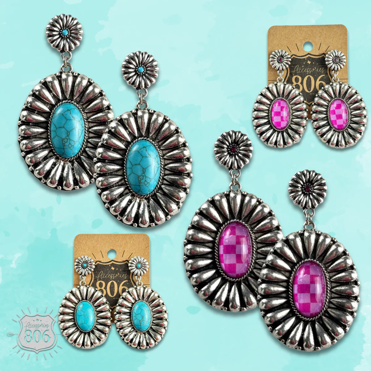 These earrings have a beautiful silver tone sunburst oval with an inlay center. They hang from a round sunburst post with a little rhinestone.