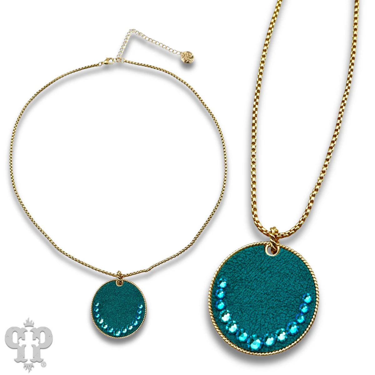 This necklace has a gold tone wheat chain with a leather disc pendant. The pendant is rimmed with hand set Austrian crystals