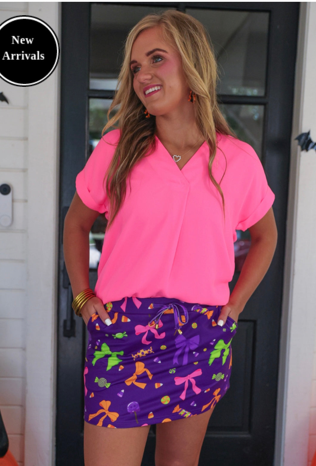 Be the treat of the night in our Trick Or Chic Skort! Made with lightweight fabric, it features an elastic band on the back and built-in shorts to keep you comfortable yet totally on-trend. Side pockets and a drawstring add a practical finishing touch to the fun vibe.