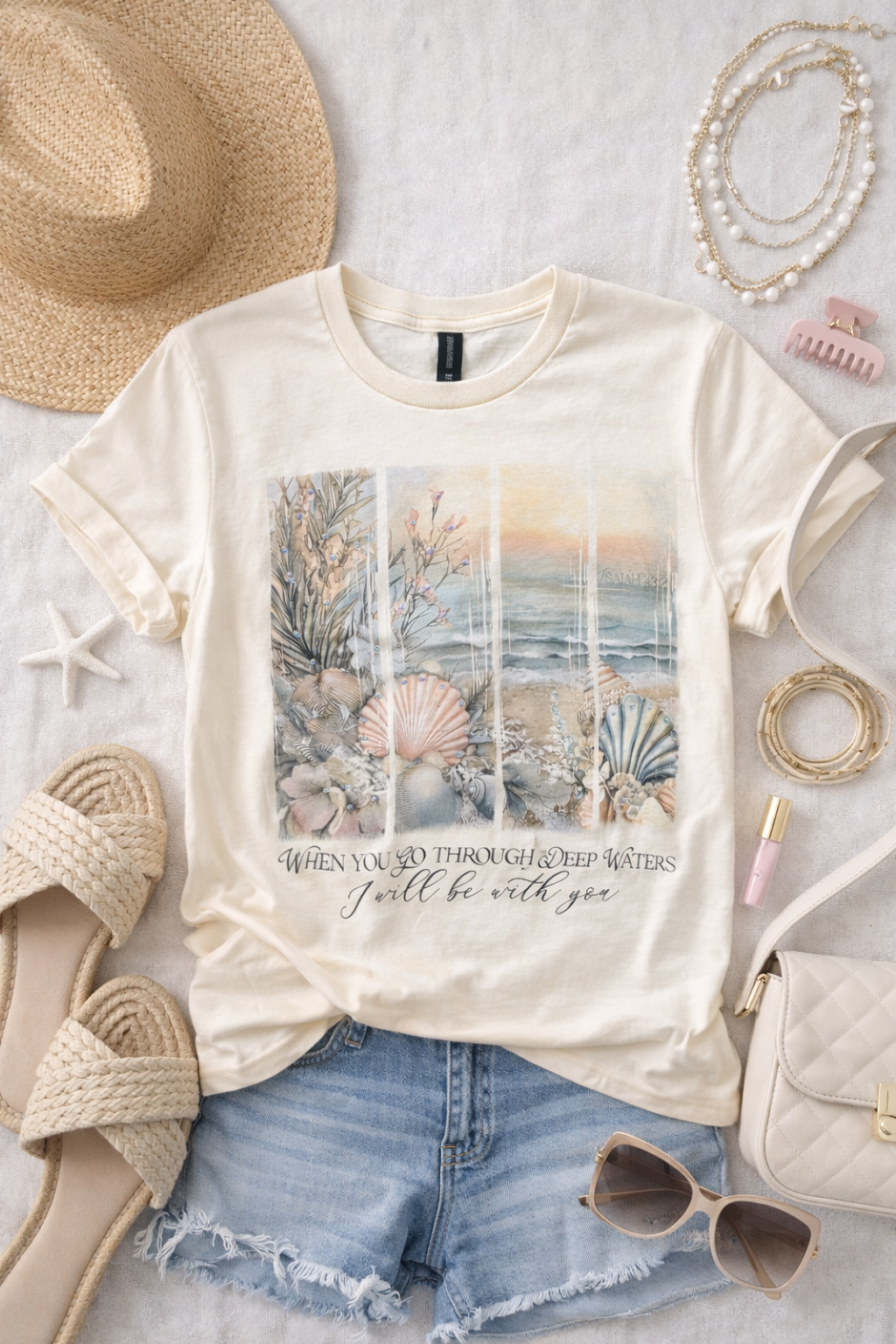 Soft, serene, and faith-filled 🌊🤍 This off-white Gildan Softstyle tee features a beautiful coastal collage of seashells, ocean waves, and muted sunset tones with the inspiring phrase, “When you go through deep waters, I will be with you.” Subtle rhinestone accents add the perfect touch of shimmer.