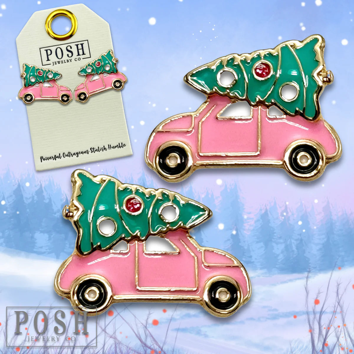 These adorable stud earrings have a pink car with bling Christmas tree sitting on top. They come in just under an inch and will elevate your holiday attire.