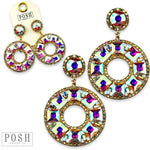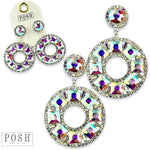 This earring has a round rhinestone post with tiny rhinestones around the rim. The lower part of the earring has square rhinestones with two rows of tiny rhinestone borders in a circle shape. It has a post setting and measures approximately 2.5 inches.