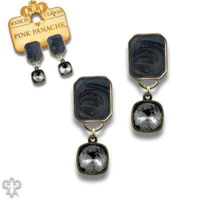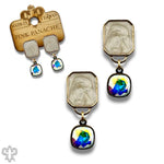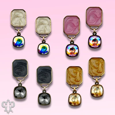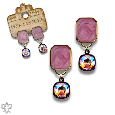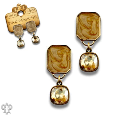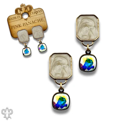 This earring has a pearlescent rectangle in a gold tone setting with a post back. There is a 10mm Austrian crystal dangling below in a setting custom made for Pink Panache in the USA. The earring measures approximately 2 inches in length.