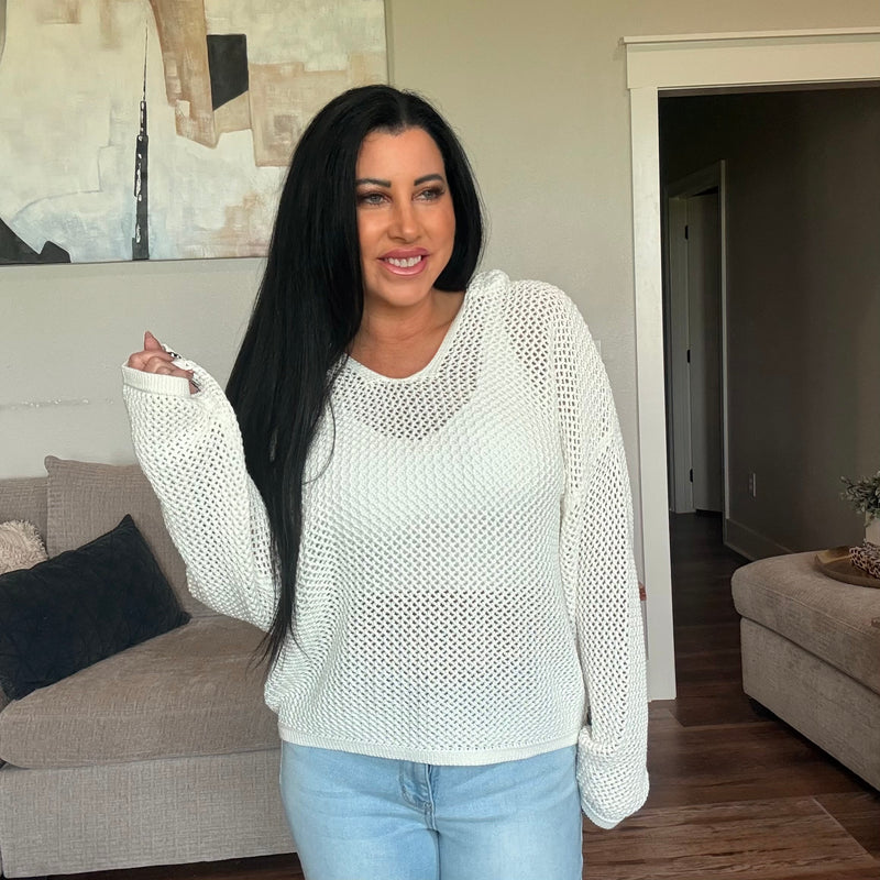 This is a fun and chic hoodie with an open knit and relaxed style.